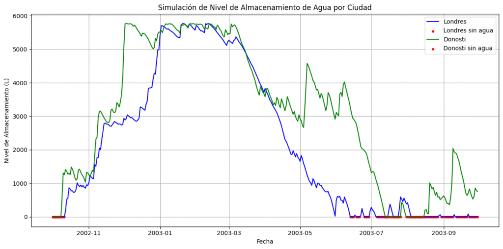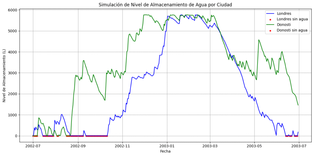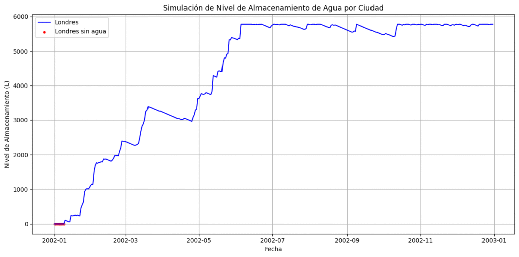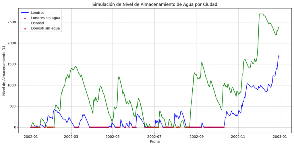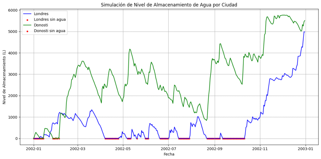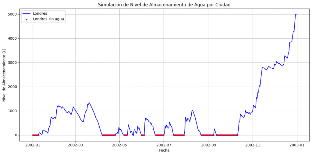 Aquí están los resultados de la simulación con la evolución del nivel de agua almacenada en Londres durante el año 2002. Cada vez que el nivel cae a cero, marcado en rojo, significa que los personajes se han quedado sin agua.