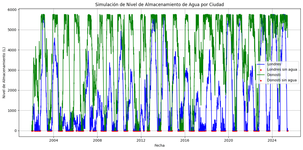 Curiosamente, en Donosti incluso la cosa va a mejor, al menos en 2002 que parece que llovió suficiente en julio (el Jazzaldi no falla). En cualquier caso, sigue siendo importante no empezar de cero absoluto y resistir unas semanas hasta que empiece a funcionar bien el sistema. Al menos, con lo mínimo para beber 1 litro por persona al día durante 3 semanas. Digamos 40 litros. En el caso de Londres vemos que tendríamos un verano muy difícil pero es que además, y esto es lo más relevante, incluso cuando el sistema ya ha cogido inercia y pasamos un invierno con el almacenamiento al máximo, en el siguiente verano, en 2003, volvemos a caer a cero, lo que deja claro que el sistema es inviable a largo plazo, tal y como lo hemos planteado, sin recursos adicionales. Por el contrario, en Donosti aunque vuelve a bajar en el siguiente verano, está muy lejos de tocar suelo.