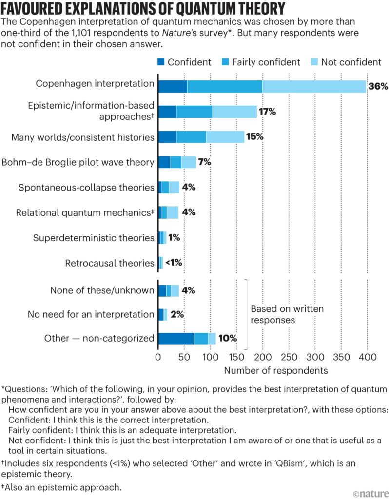 El punto de partida implícito del cuento es la interpretación de los muchos mundos de Hugh Everett. Sí, lo del multiverso. Ya sabéis que aunque somos capaces de calcular y predecir con gran precisión los fenómenos cuánticos, la interpretación filosófica que hay detrás del colapso de la función de onda (¿La realidad está definida antes de que la observemos? ¿Qué tal el gato?) difiere y hay varias escuelas diferentes. La interpretación de Copenhague, simplificando bastante, sostiene que la teoría cuántica no asigna valores definidos a ciertas magnitudes hasta que se produce una medición. Antes de medir, el sistema se describe mediante una superposición de posibilidades; tras la medición, obtenemos un resultado concreto. Qué significa exactamente ese “paso” -si implica un cambio físico real o solo un cambio en nuestra descripción- es una cuestión que ha dado lugar a décadas de debate. Por lo general, esta interpretación resulta poco grata para la intuición humana. La interpretación de Everett, propuesta en los 50 propone algo más asombroso, aunque también más fácil de entender: la onda no colapsa, en lugar de eso, todos los universos que serían posibles lo son, no se elige ninguno de ellos, sino que coexisten. Es la interpretación que más juego ha dado a la literatura y el cine. Aunque Copenhague sigue siendo mayoritaria entre la comunidad científica, la interpretación de Everett que puede parecer más loca, cada vez tiene más adeptos entre los físicos, tal y como se va viendo cada vez que hacen una nueva encuesta. En esta de 2025 ya alcanzan un 15%.